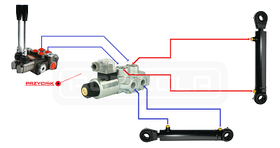 Przykładowe sterowanie: dwa niezależnie działające siłowniki 2-stronnego działania sterowane z jednej sekcji w rozdzielaczu hydraulicznym. |
