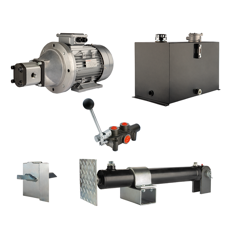 Zestaw elementów do budowy układu hydraulicznego w bardzo mocnej i wydajnej łuparce do drewna. Parametry hydrauliczne elementów z zestawu zostały dobrane do łuparek pracujących w trybie ciągłym w ciężkich warunkach, w których nie sprawdzają się oferowane na rynku komercyjne, gotowe łuparki. Moc siłownika łupania w oferowanym zestawie umożliwia łupanie średnich i dużych pni z drewna: