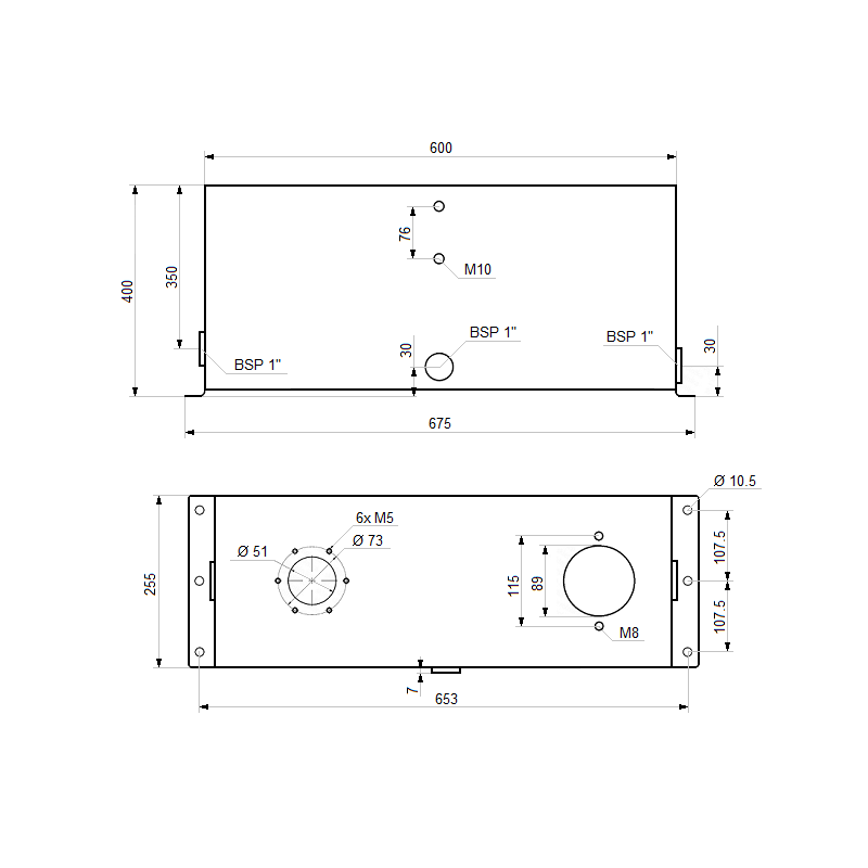 Kompletny zbiornik olejowy z mocowaniem do podstawy, wyposażony w korek wlewowy z odpowietrznikiem i siatką filtrującą, miarkę poziomu oleju z termometrem, korek zlewowy z magnesem oraz filtr zanurzeniowy z bypasem przy ciśnieniu 1,5 bar i wymiennym wkładem. |