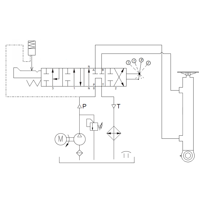 Zaprojektowany specjalnie do łuparek do drewna. Na suwak w jedną stronę działa sprężyna, a w drugą jest zatrzask z odskokiem. W trakcie łupania, ze względów bezpieczeństwa, rozdzielacz wymaga przytrzymania dźwigni, natomiast powrót tłoczyska jest na zatrzasku, który sam odskakuje gdy siłownik schowa się do końca i wróci do pozycji startowej. Rozwiązanie to pozwala na zmianę pnia i sprzątnięcie łupin podczas ruchu powrotnego tłoka. Dodatkowo, po powrocie tłoczyska, zatrzask sam odskakuje i odciąża pompę, dzięki temu układ hydrauliczny się nie grzeje. W pozycji neutralnej olej swobodnie przepływa przez rozdzielacz i idzie na kanał powrotny do zbiornika. Rozdzielacz posiada dodatkowo dwie prędkości wysuwu tłoczyska, które wysuwa się szybciej w drodze do pnia, natomiast po dotarciu zwalnia i nabiera mocy nacisku. Rozwiązanie to przyspiesza cykl łupania zwiększając wydajność łuparki oraz eliminuje efekt uderzenia elementu łupiącego w pień, zjawisko to stwarza wiele problemów podczas pracy z łuparką. |
