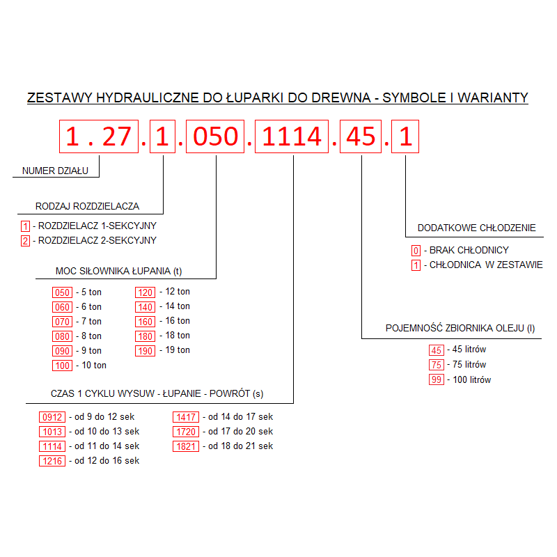 Zestaw elementów do budowy układu hydraulicznego w bardzo mocnej i wydajnej łuparce do drewna. Parametry hydrauliczne elementów z zestawu zostały dobrane do łuparek pracujących w trybie ciągłym w ciężkich warunkach, w których nie sprawdzają się oferowane na rynku komercyjne, gotowe łuparki. Moc siłownika łupania w oferowanym zestawie umożliwia łupanie średnich i dużych pni z drewna: